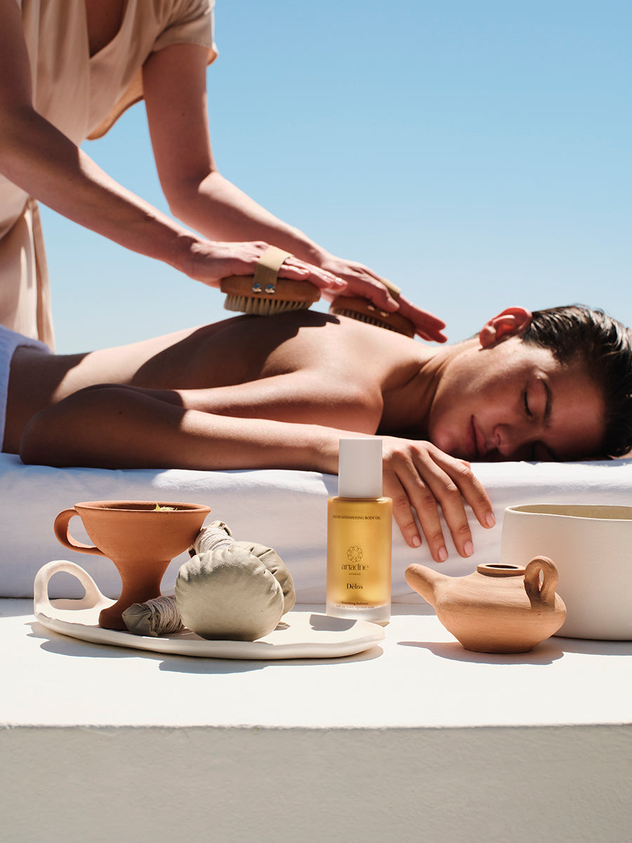 Immerse yourself in the captivating allure of Dιlos with this luxurious body ritual. Beginning with an ancient Greek technique, the experience features a dry-brush exfoliation with a natural horsehair brush, refining the skin, boosting circulation, and preparing you for the indulgent steps ahead. Surrender to a deeply restorative anti-stress massage with the Delos Oil, infused with our signature fragrance. The opulent oil melts away tension, enveloping your body in a radiant, fragrant glow. The ritual also includes a soothing scalp massage and hair brushing with a natural resin comb, enhancing relaxation for the ultimate experience. Celebrating beauty and femininity, this ritual brings out the inner goddess in every woman, leaving you revitalized, pampered, and glowing like the brilliance of the Aegean sun.