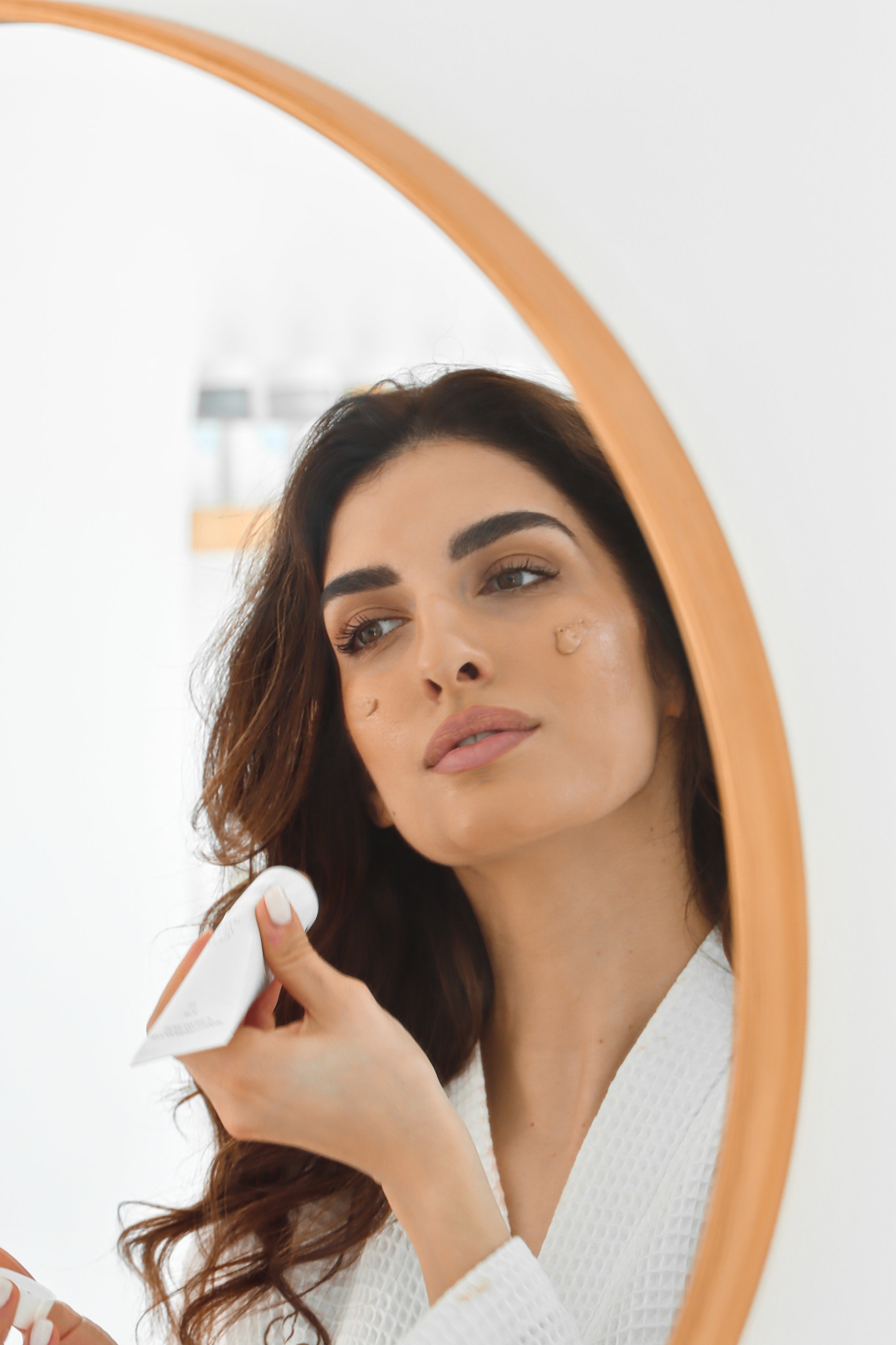 Χρησιμοποιώντας πινέλο, σφουγγαράκι ή τα δάχτυλά σας, εφαρμόστε ένα ομοιόμορφο στρώμα σε όλο το πρόσωπο ή σε οποιεσδήποτε ανομοιόμορφες περιοχές και αναμείξτε. Για όλους τους τύπους δέρματος. Μόνο για εξωτερική χρήση.